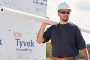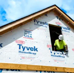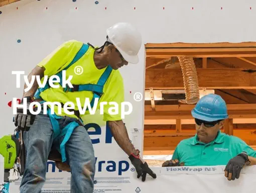 DuPont™ Tyvek® HomeWrap® is the original house wrap, engineered to keep air and water out while allowing water vapor to escape. It helps protect homes from wind and rain, improving durability by preventing moisture penetration. Tyvek® HomeWrap® also boosts energy efficiency by reducing air flow and water intrusion, allowing insulation to perform better and HVAC systems to work more efficiently. This advanced wrap helps keep homes cool in the summer, warm in the winter, and dry throughout the year.